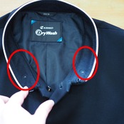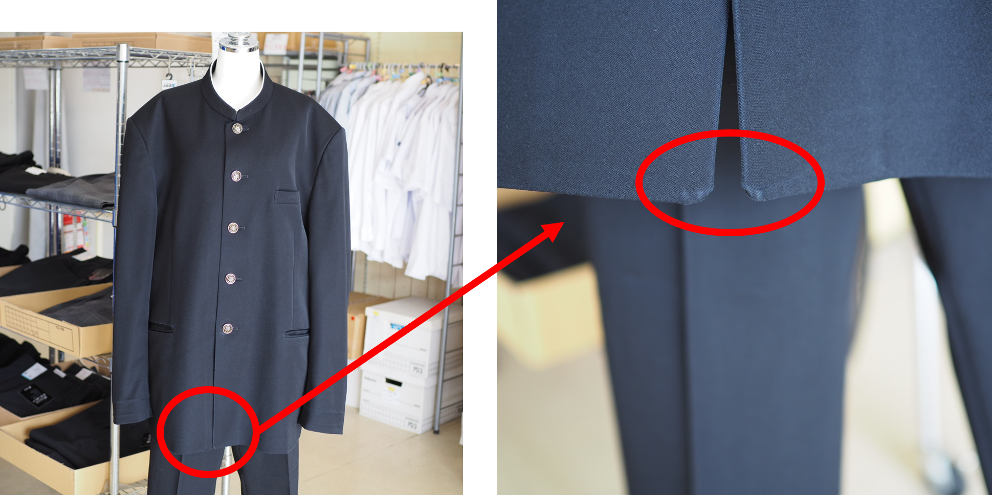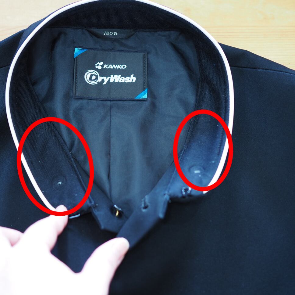 襟内側に小さな毛玉、組章・校章の穴があります(4枚目)