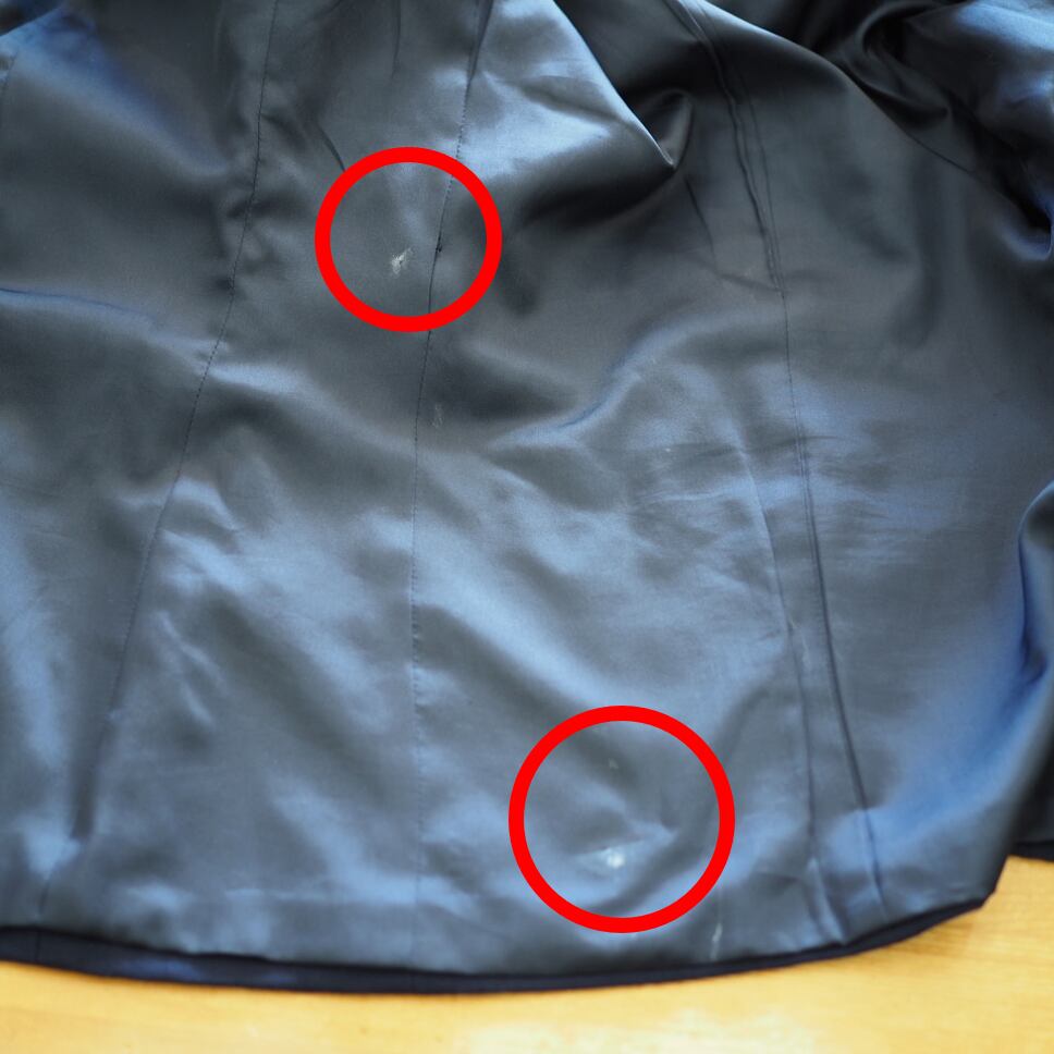 前裾に白くなっている箇所(赤丸)ほつれ(緑丸)があります(8枚目)
