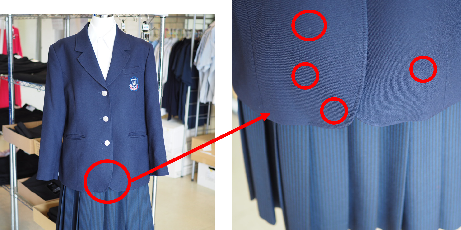 うしろ側 裾が白くなっている(赤丸)、その付近に小さな毛玉や毛羽立ちが見受けられます(9枚目)